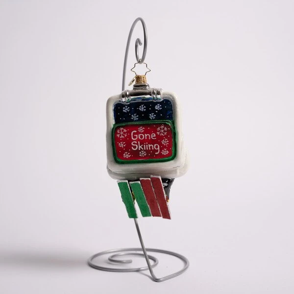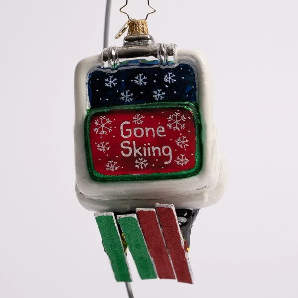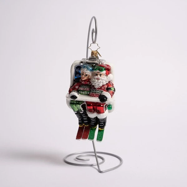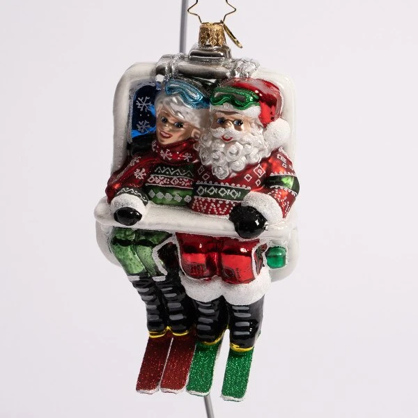 All snuggled up close in a chair lift seat, Santa and the Misses are going to hit the slopes. This Christopher Radko glass ornament measures 5.75 inches in height.