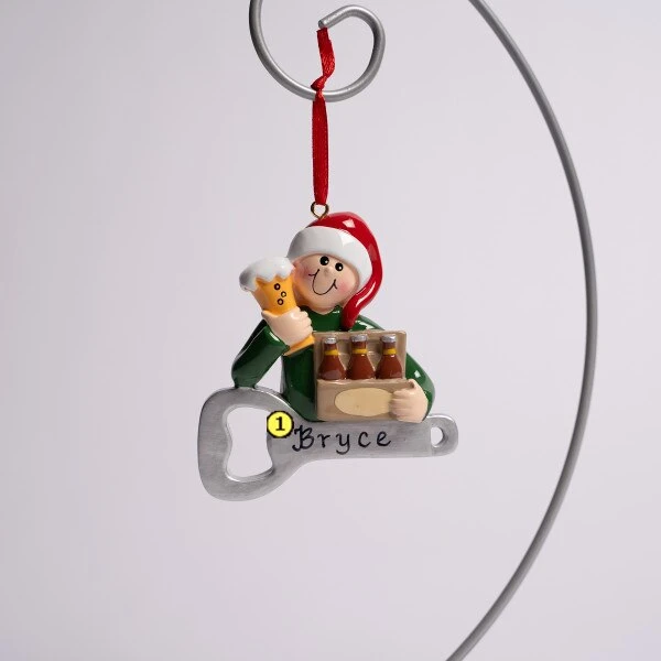 This ornament features a six pack, a bottle opener, a glass of your favorite bubbly. It can be personalized and measures 3.5 inches in height.