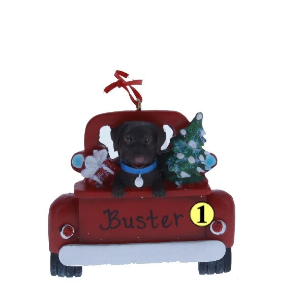For all of the Labrador lovers, this ornament is perfect for you. It features a chocolate lab in the back of a red truck with a glittered Christmas tree and present.