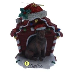 For all the Chocolate Labrador lovers out there, this Kurt Adler ornament is perfect for you! It features a Chocolate Lab with a Santa hat in front of their doghouse, which is decorated in Christmas lights and has a giant Santa hat on top. In front of the Lab is a big bone where you can personalize this ornament with your four legged friend’s name.
