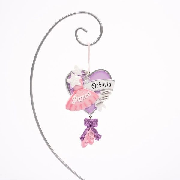 Celebrate your tiny dancer with this personalizing ornament. This ornament features a pink tutu that says “Dance” across the bottom, with ballet slippers that dangles from the ornament.
