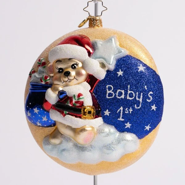 The teddy bear is surrounded by stars in the sky, with a cloud underneath and a moon behind. This Christopher Radko glass ornament measures 5 inches in height.