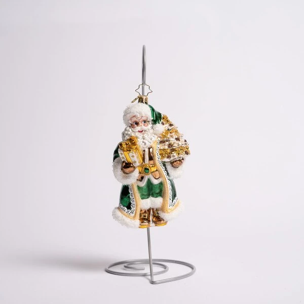 Santa is looking classy in green, with gold and white lining and holding a present and tree. This Christopher Radko glass ornament measures 6 inches in height.