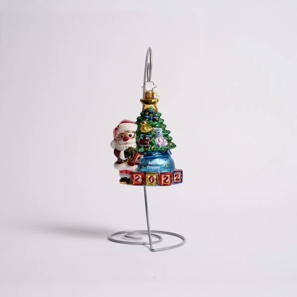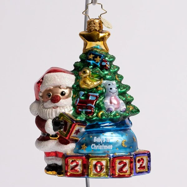 Santa has a tree for 2022, and a sack full of presents for a first Christmas. This Christopher Radko glass ornament measures 5 inches in height.