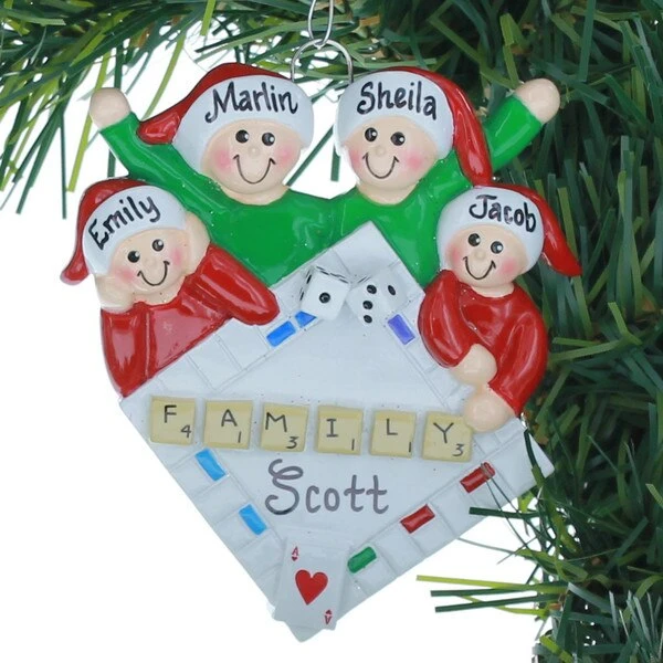 Commemorate those special nights of playing games with this family of 4 ornament. Personalizing available and measures 3.25 inches in height.