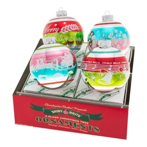 Add a nostalgic touch to your tree with this collection of four glass rounds, accented by bright holiday hues and vintage-inspired flocked vignettes.