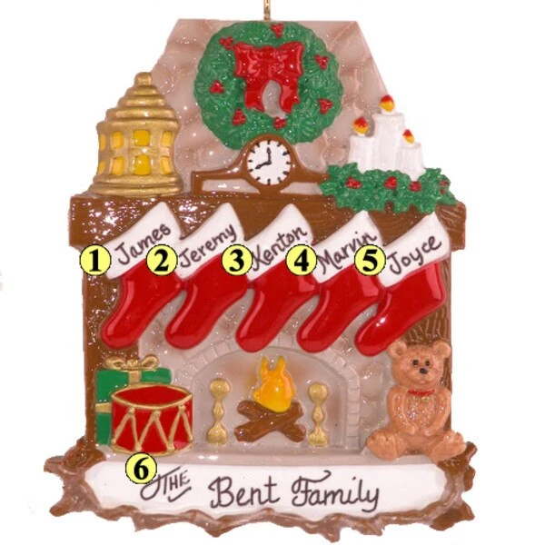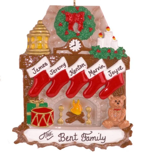 This fireplace ornament has been decorated for the season complete with 5 stockings. It measures 4 inches in height and can be personalized.