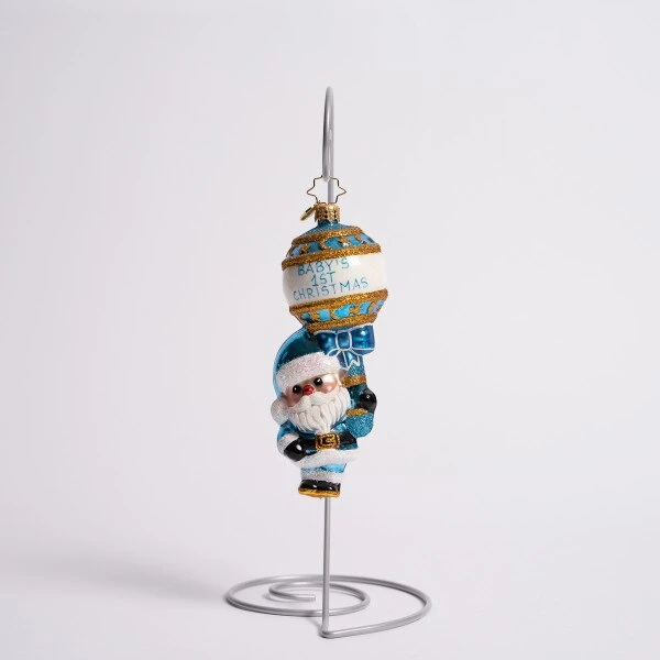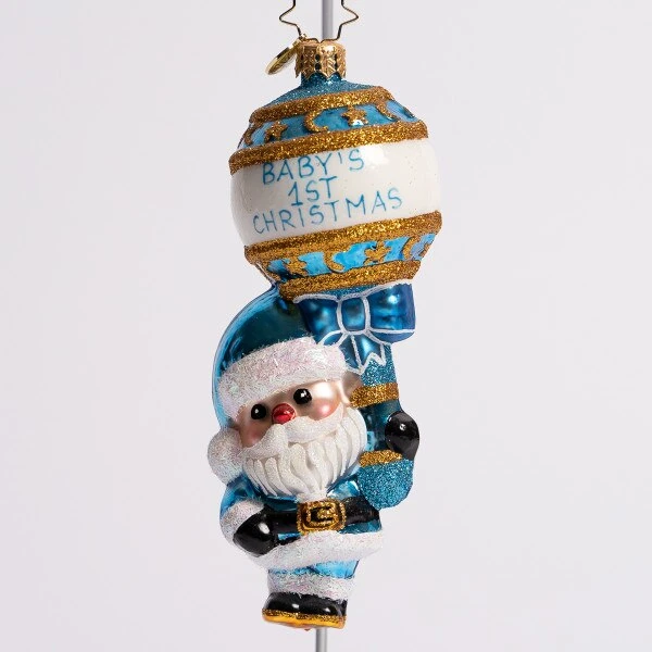 Santa has a gift for that bouncing baby boy, the first Christmas is special so he gets his first rattle toy. This Christopher Radko glass ornament measures 5.5 inches in height.