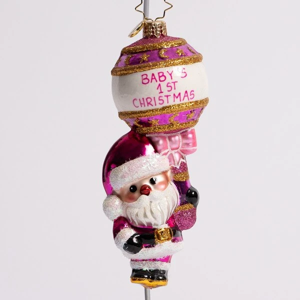 Santa is holding a rattle while decked out in pink, to celebrate the first Christmas for your baby. This Christopher Radko glass ornament measures 5.5 inches in height.