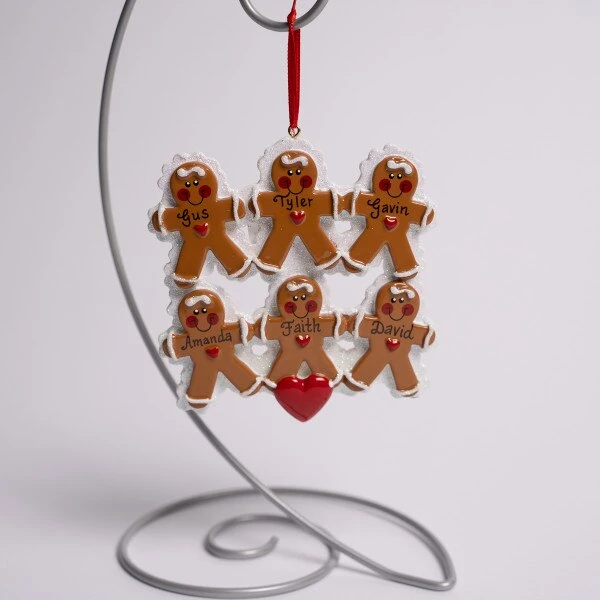 This ornament features a family of 6 gingerbread people holding hands. It can be personalize and measures 4.25 inches in height.Â