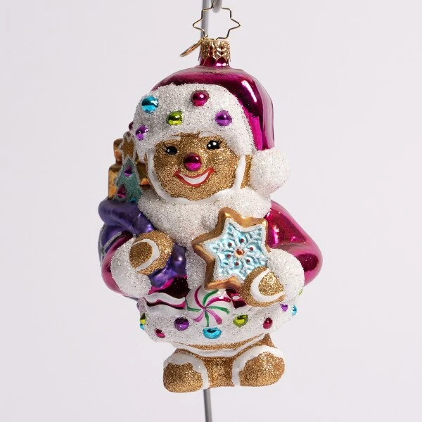 This little gingersnap is loaded with sweets, wearing a Santa suit for a special delivery. This Christopher Radko glass ornament measures 5 inches in height.