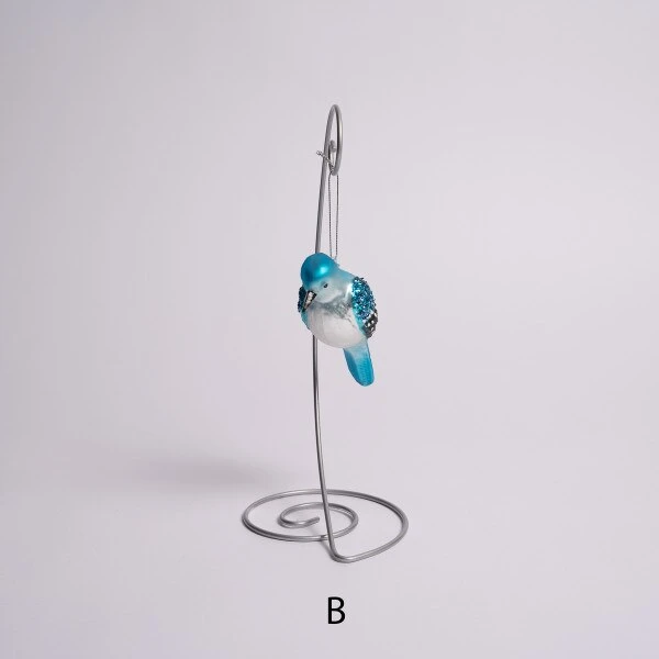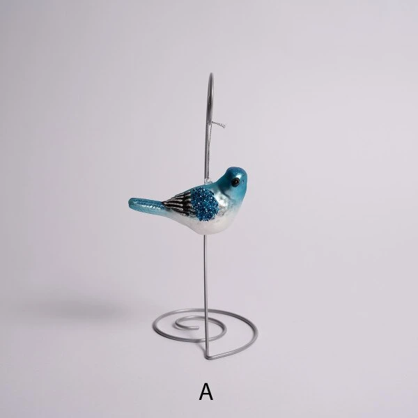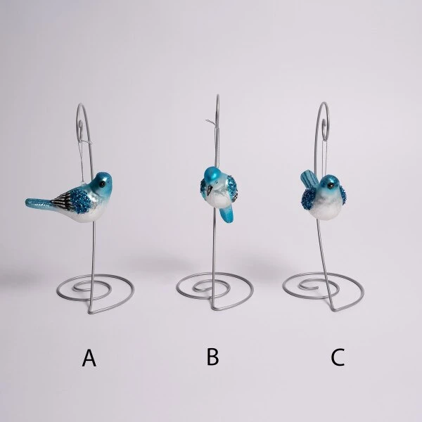 This assortment of 3 glass blue bird ornaments feature black and white painted wings with blue glitter and a white glittered breast. Each sold separately and measure 3 inches in height.