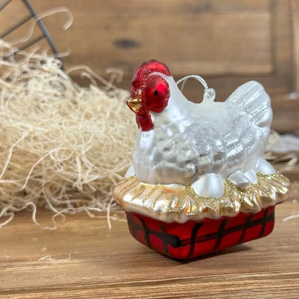 This glass ornament features a chicken sitting on a nest and measures 4 inches in height.