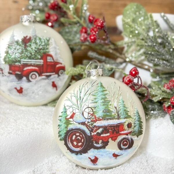 Your guests will love this glass Christmas tree hanging ornament of a vintage red truck or tractor in a winter scene to go with your red truck theme! There are three versions which are a red farm truck carrying the fresh cut Christmas tree, a red tractor covered in snow and another vintage style red truck carrying a Christmas tree. Each sold separately.