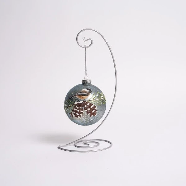This glass mercury ball ornament has a chickadee sitting on a pinecone. This ornament measures 4 inches in height.