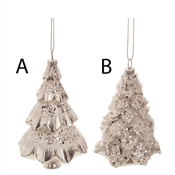 There are two ornaments in this assortment. One tree is smooth with glitter on the top of the branches. The other looks icy with lots of glitter and sequins.