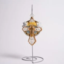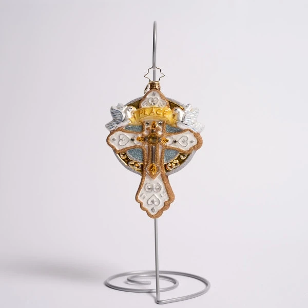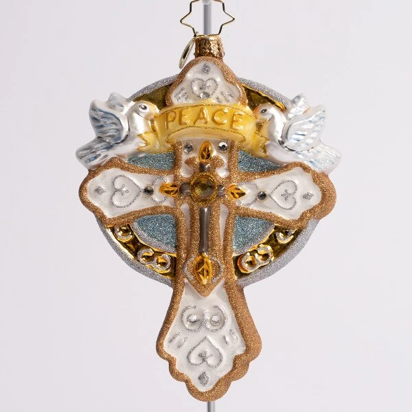 The doves are holding the ribbon of peace, atop this gold edged cross where the turmoil must cease. This Christopher Radko glass ornament measures 5.5 inches in height