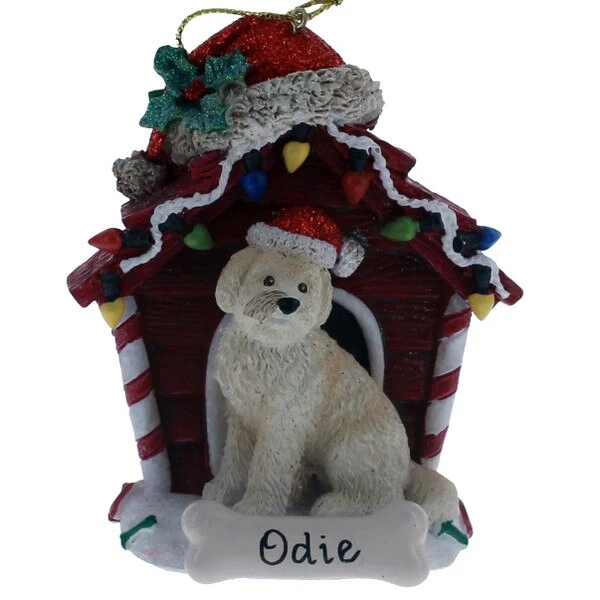 For all the Goldendoodle lovers out there, this Kurt Adler ornament is perfect for you! It features a Goldendoodle with a Santa hat in front of their doghouse, which is decorated in Christmas lights and has a giant Santa hat on top. In front of the Goldendodle is a big bone where you can personalize this ornament with your four legged friend’s name.