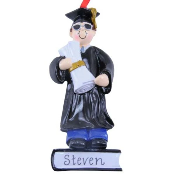 A personalizable ornament of a graduate young man holding his diploma. Made of quality resin and measures 4.25in H x 1.75in W x .25in D.