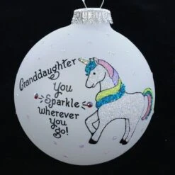 A hand painted glass ball ornament from a design inspired by Teresa Thibault features a glittered unicorn with white, teal, pink, purple and yellow colors and a “Granddaughter, you Sparkle wherever you go!” sentiment. Made of glass and measures 4in H x 3.5in diameter.