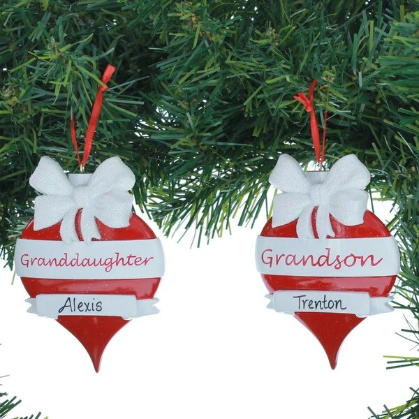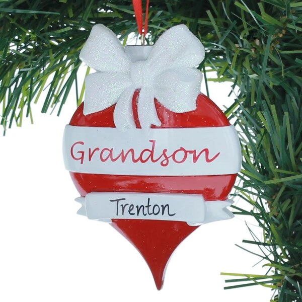 A white glitter bow tops this classic red ornament! Within the white banner, Grandson pre-printed in red! The ribbon can be personalized! The measurements for this resin ornament are 2.88 x .5 x 4.06 inches, and weighs .14 pounds.