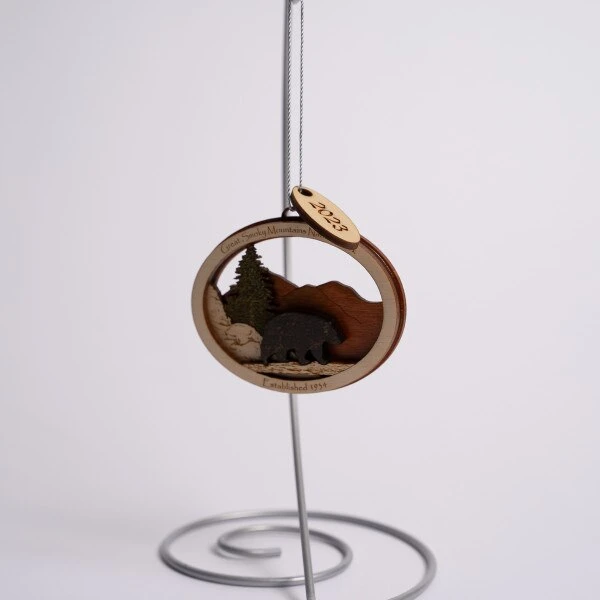 Designed by Tim Weberding Jr in the Arts and Crafts community in the Great Smoky Mountains, this handcrafted wooden ornament depicts the majestic black bear and is made from baltic birch to make multi-dimensional designs. Wooden ornament reads Great Smoky Mountains National Park and features a bear standing on a mountain. Dated with year on hook.