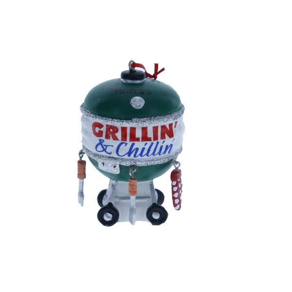 This Grillin’ and Chillin’ ornament is perfect for your summer themed holiday décor. It features a dark green and silver grill with grilling accessories.