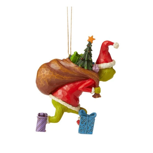 The Grinch is tiptoeing his way out of the house with all of the presents that were under the tree. This ornament measures 4.45 inches in height.