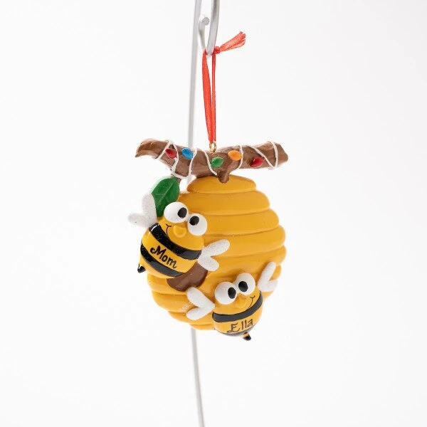 Two little honey bees flying outside their hive, which is decorated with Christmas lights. You can personalize with a name on both bees.
