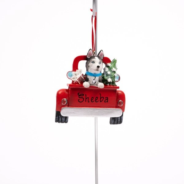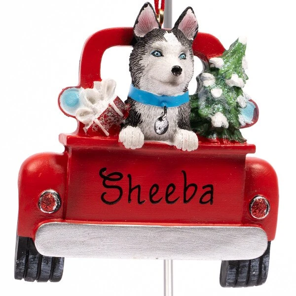 This ornament features a Husky in the back of a red truck with a glittered Christmas tree and present.