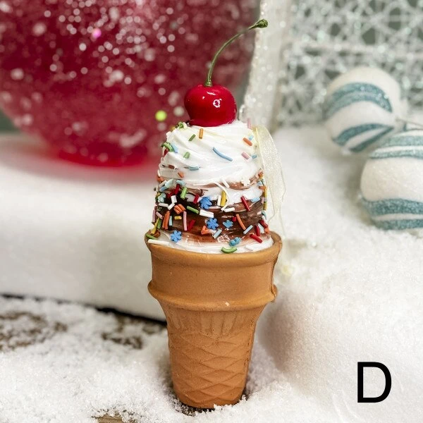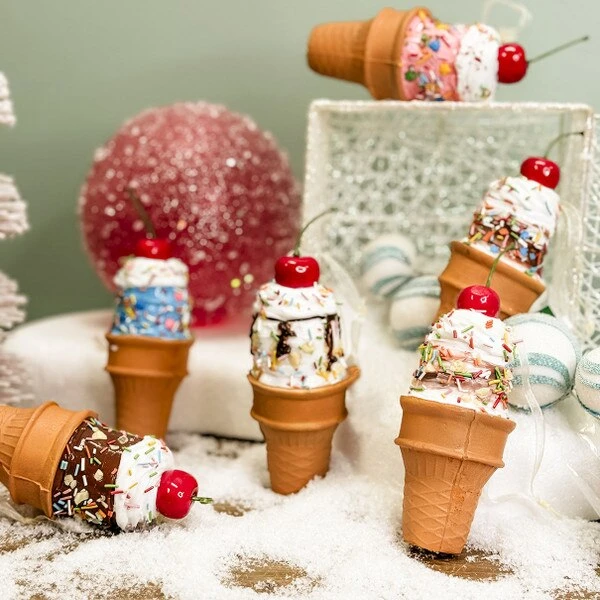 This assortment of the six ornaments feature light brown cones with different colored ice cream. It comes with six assorted colors such as pink, blue, brown, white and swirl. Each cone is topped with whipped cream, sprinkles and a cherry.