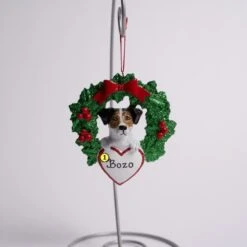 This ornament features a Jack Russell holding a heart and surrounded by a wreath. It can be personalized and measures 4 inches in height.