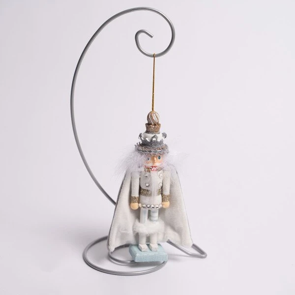 This King Swarovski nutcracker ornament is dressed in white with silver and gold accents and stands on a blue base.