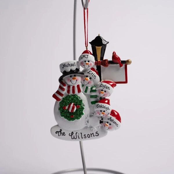 This ornament features a snowman family of 6 standing by a lamp post and enjoying the holiday season. It can be personalized and measures 4.75 inches in height.