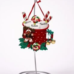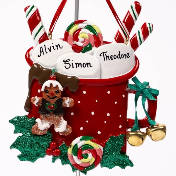 This ornament features a mug with 3 marshmallows, peppermint sticks, and a lollipop inside with a gingerbread man and holly on the outside. It can be personalized and measures 4 inches in height.
