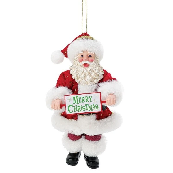 Santa is holding a sign, wishing everyone a Merry Christmas. This 2023 ornament measures 6 inches in height.