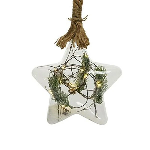 A rope hold this lovey glass star. In the star are micro lights and pine! This will make an amazing addition to your Christmas arrangements!