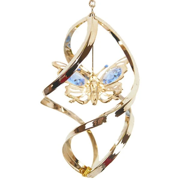 Pretty blue faceted crystals color the wings of this golden butterfly. It is suspended inside a triple golden spiral. It is equally lovely on a Christmas tree or hanging in a sunny window.