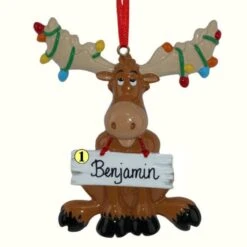 This moose has his antlers lighted and holds a plank which you can personalize with the name of a child, friend, or family member. A unique and fun gift, it will be enjoyed on the Christmas tree for seasons to come.