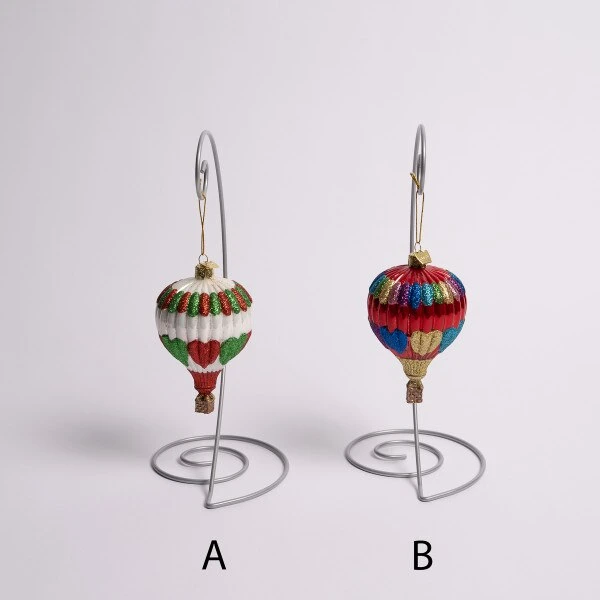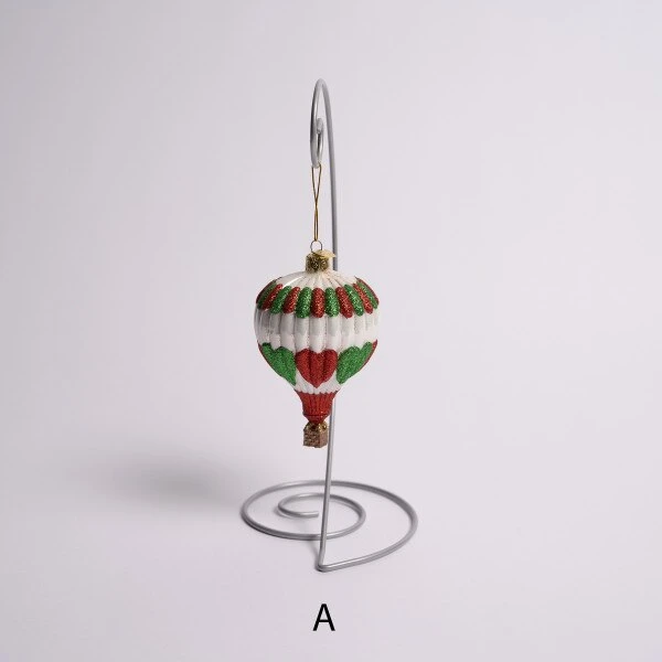 This assortment of ornaments features hot air balloons in rainbow colors and are made of glass. They are part of the noble gems collection. Each sold separately and measure 4.5 inches in height.