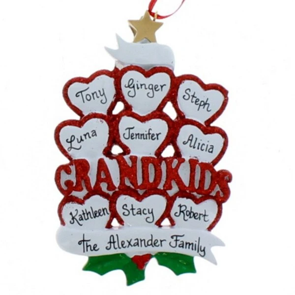 This ornament is festively detailed with holly, hearts and glitter. With room for nine names our personalization staff will make this an ornament your family will treasure for years to come.