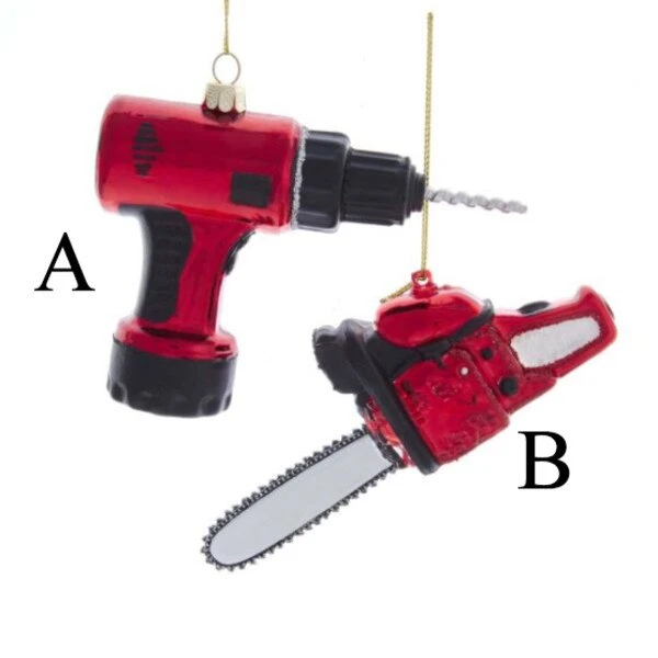 Kurt Adler’s Noble Gems power tool glass ornaments are the perfect addition to your DIY holiday décor. Included in this assortment are a red, black and silver electric drill and chainsaw, Each ornament is decorated with red and silver glittered accents.