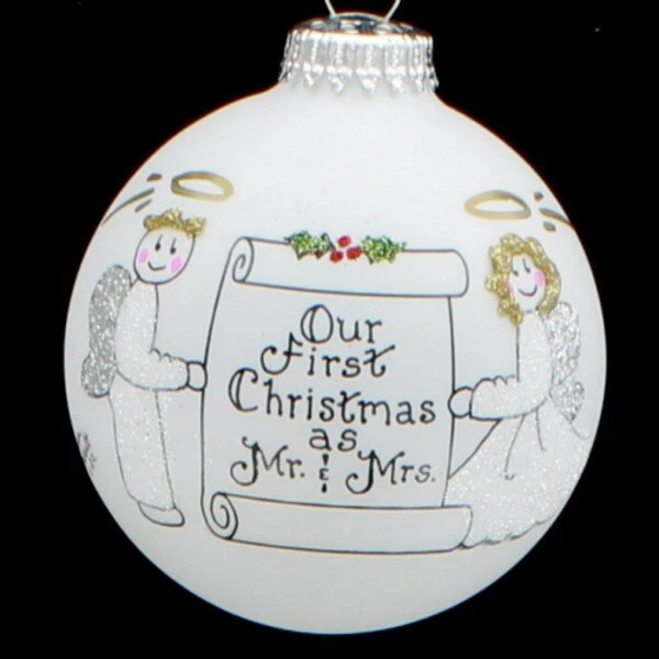 A first-time Christmas proclamation for proud newlyweds. Hand painted from a design inspired by Teresa Thibault this ornament comes attractively packaged for easy gift giving. Â It can be personalized on the back with a name.
