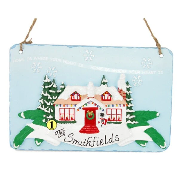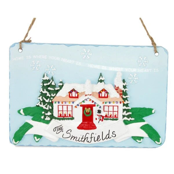 This adorable Our Home Door Plaque displays a snow-laden house decked out in holiday decorations and surrounded by snowy evergreens. A banner displays the family name and across the top is the phrase “Home Is Where Your Heart Is”.Â
