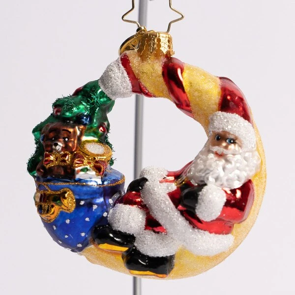 Santa is over the moon with excitement for the holiday season. This Christopher Radko glass gem ornament measures 3 inches in height.