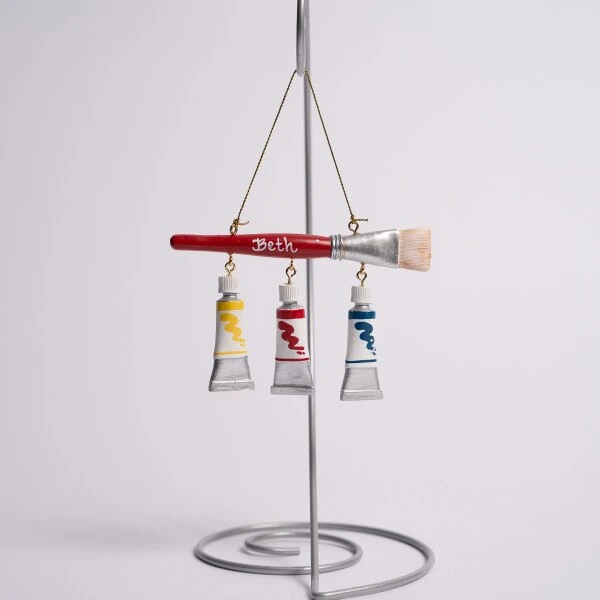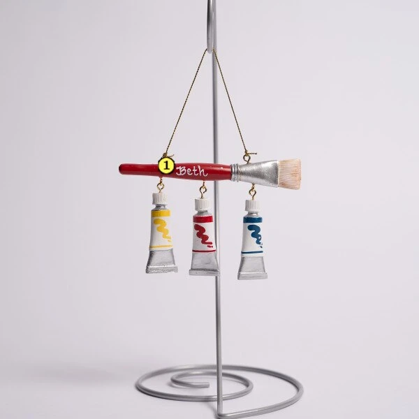 Celebrate the artist in your family with Kurt Adler’s paintbrush ornament. This ornament features a red paint brush with red, yellow and blue paint tube dangles