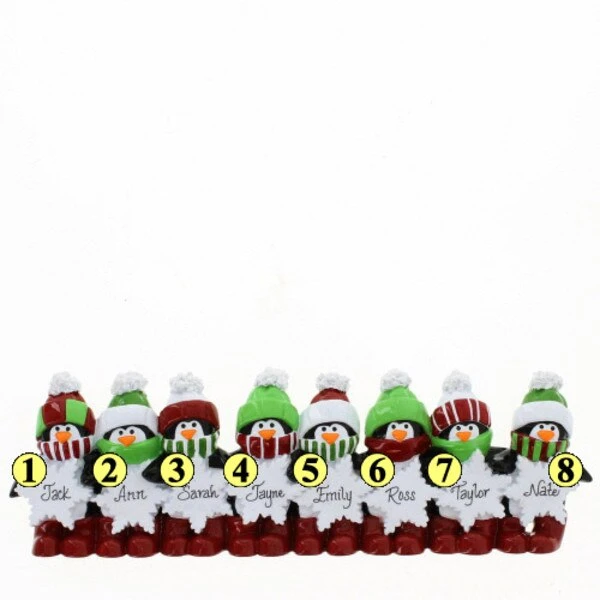 This table top ornament features a family of 8 penguins and measures 3.25 inches in height.