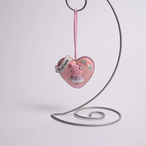 Peppa Pig loves to dance! In a pink glitter heart Peppa Pig is a ballerina! Personalize the banner with the name of the Peppa Pig fan in your family. The saying “Fairytale Ballerina” is pre-printed in the heart. This resin ornament measures 3.13 x .75 x 3 inches and weighs .15 pounds.Â