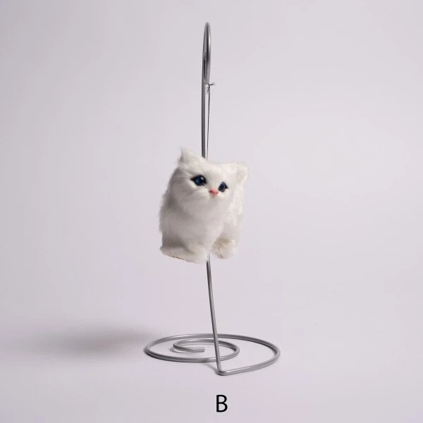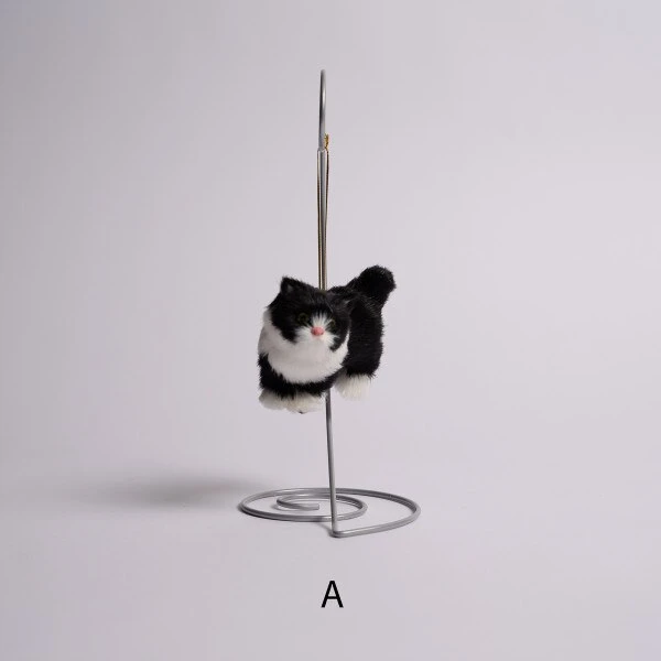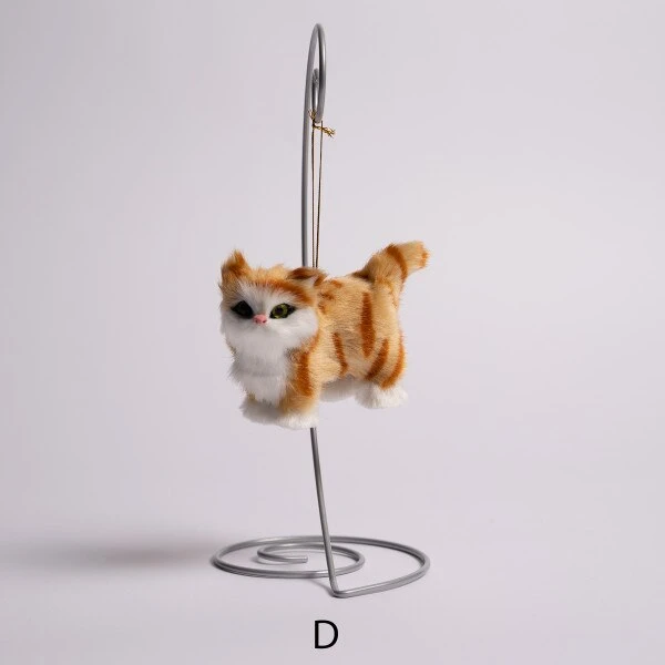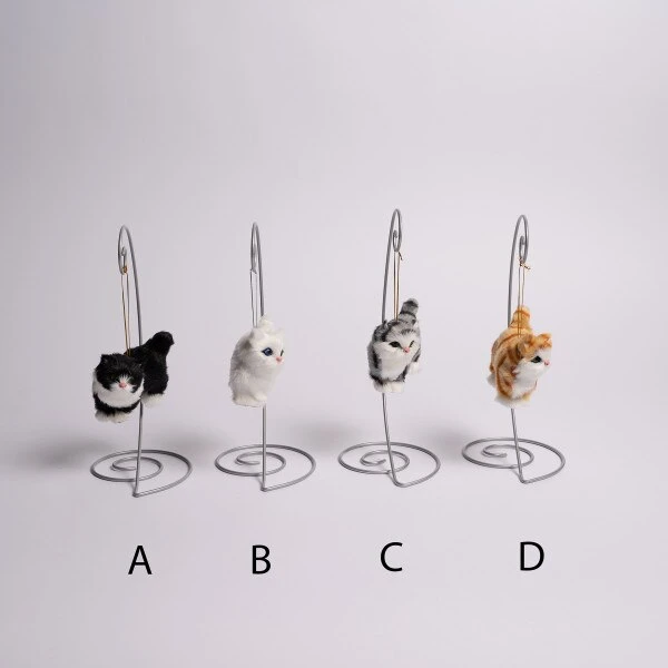 This assortment of 4 features a tabby cat with orange fur and brown stripes, a white cat with blue eyes, a black and white cat with green eyes, and a grey striped cat with brown eyes. Each sold separately and measure 3 inches in height.