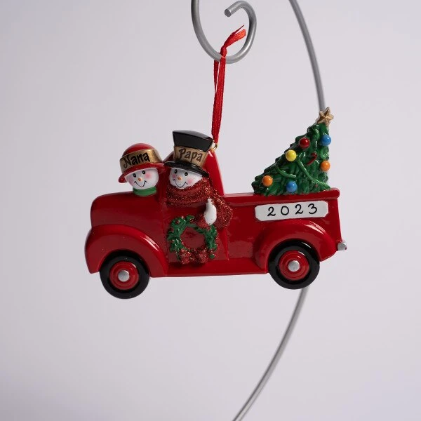 This ornament features a snowman couple hauling their tree home in the back of a red truck. It can be personalized and measures 3.25 inches in height.
